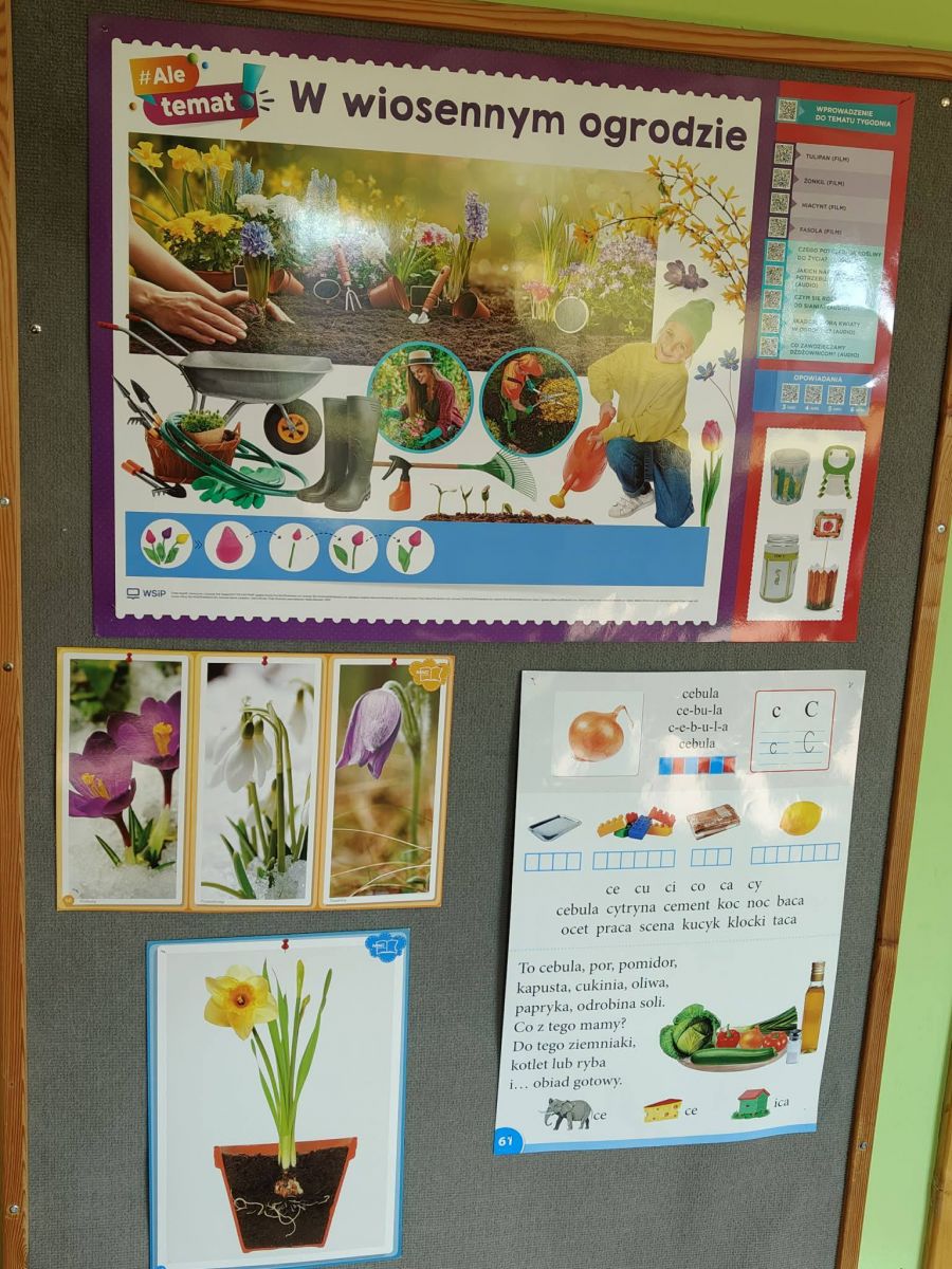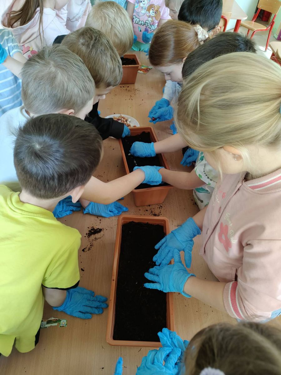 rozpoczęły wiosenne prace w kąciku przyrody. Sadziły cebulki i siały kwiatki. Zajęcia miały na celu poszerzanie wiadomości na temat niezbędnych warunków do rozwoju roślin