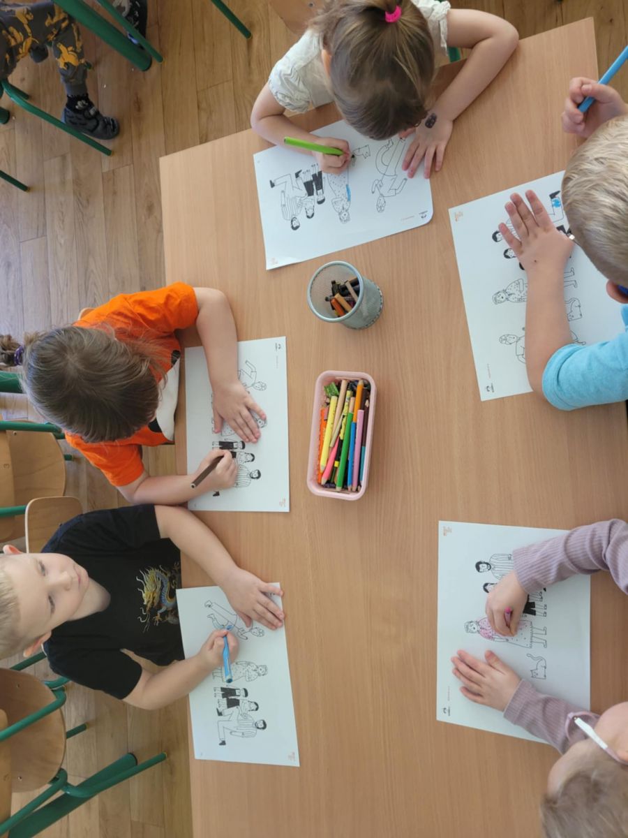 Na zakończenie zajęć „Misie” wykonały pracę plastyczną inspirowaną opowiadaniem – ich dzieła przedstawiały młodych bohaterów, symbole Polski i biało-czerwone barwy.