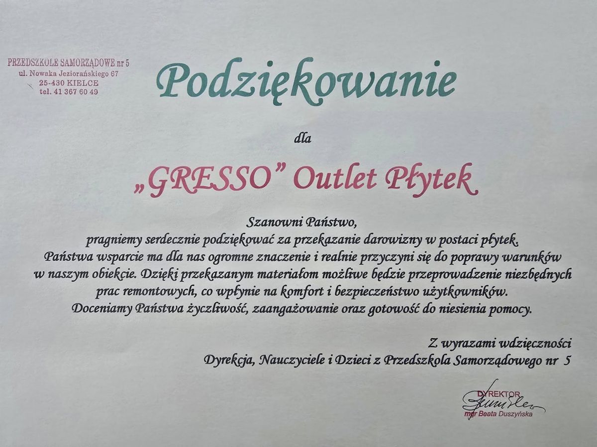 Z rąk Pani Dyrektor Przedszkola Samorządowego nr 5 w Kielcach otrzymaliśmy podziękowanie za przekazanie płytek gresowych, które pomogą w poprawie warunków przedszkolaków Pomagajmy