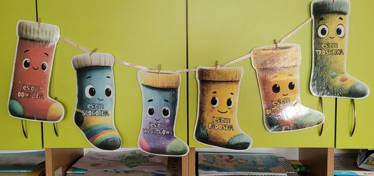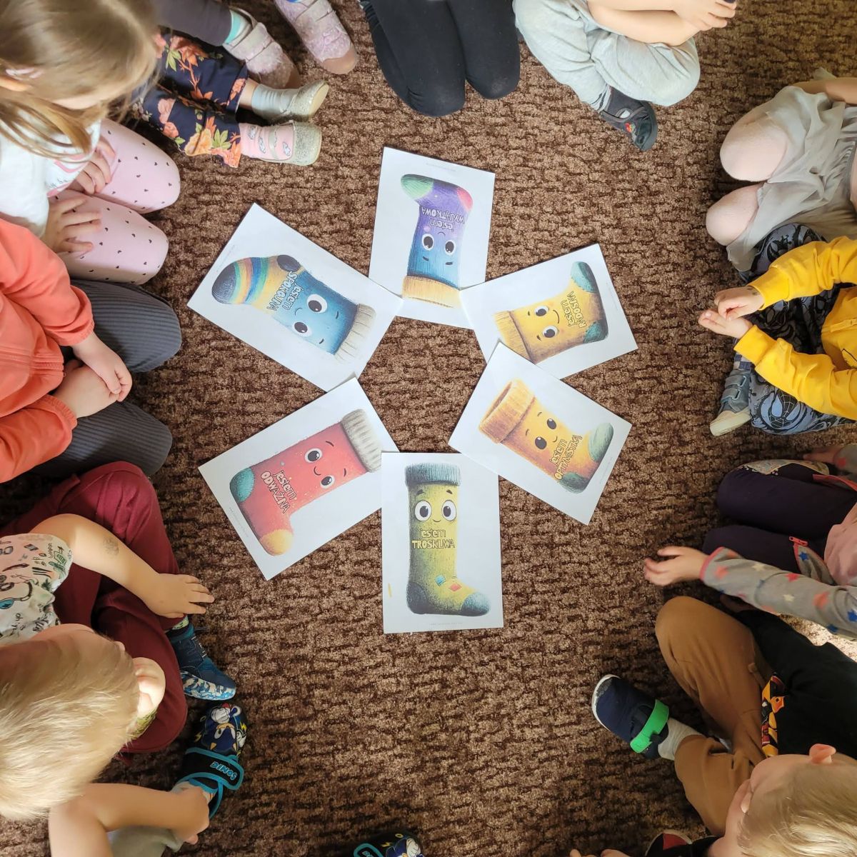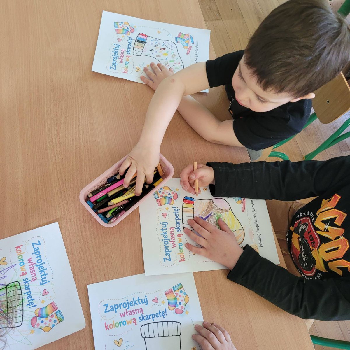 Nie zabrakło również twórczej zabawy – dzieci zaprojektowały własne, bardzo kolorowe skarpetki, wykazując się dużą pomysłowością i zaangażowaniem. Był to dzień pełen nauki i wartościowych rozmów.