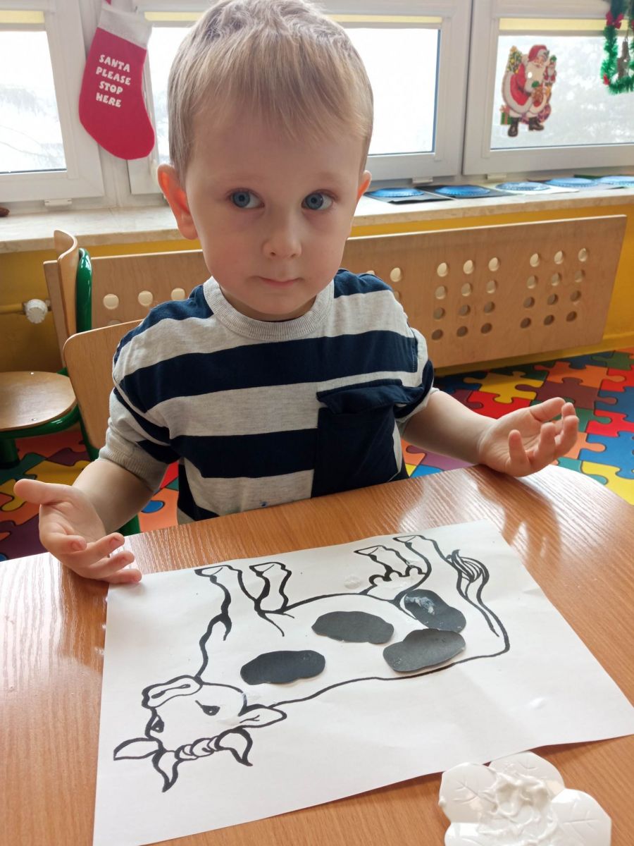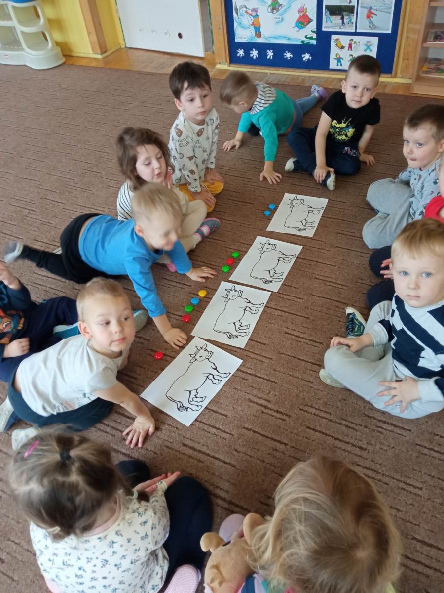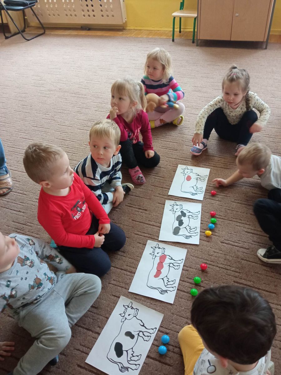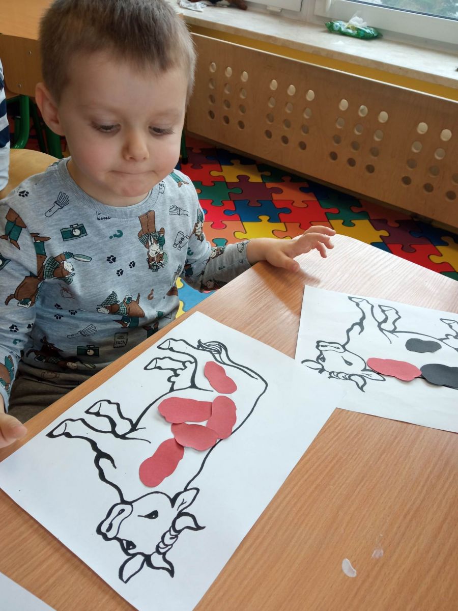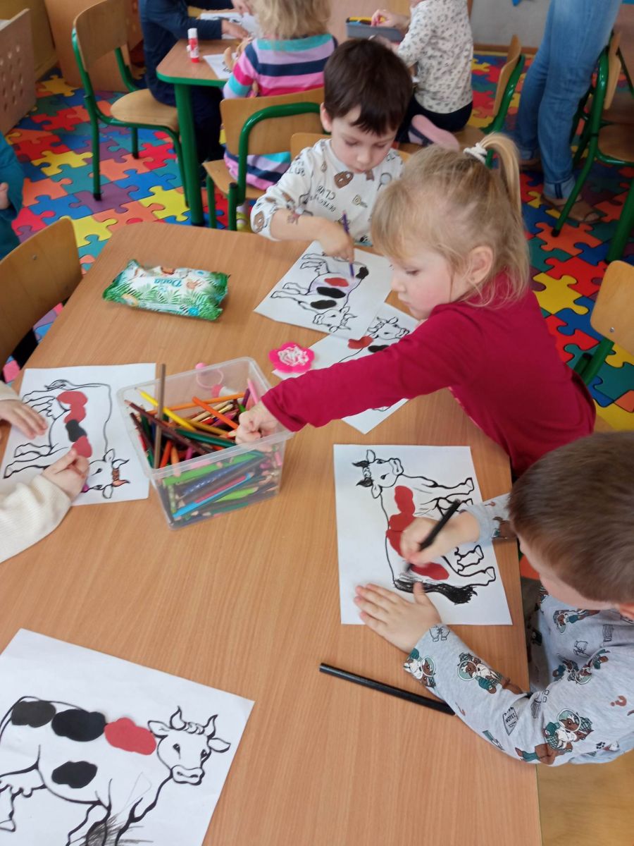 W dniu dzisiejszym grupa I obchodziła Dzień Mleka. Dzieci obejrzały film edukacyjny pt. "Skąd się bierze mleko?", wysłuchały wiersza o mleku, rozwiązywały zagadki słowne dotyczące tematu, przyklejały "łatki" na sylwecie "krówki". Celem zajęć było zapoznanie dzieci z wartościami odżywczymi oraz znaczeniem mleka i produktów mlecznych dla naszego zdrowia.