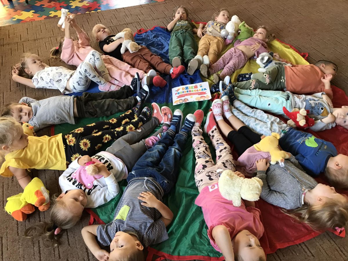 Z tej okazji nasza sala gimnastyczna zamieniła się dziś w salę kinową. Wszystkie dzieci z ulubionymi przytulankami, kocykami oglądały filmy animowane.