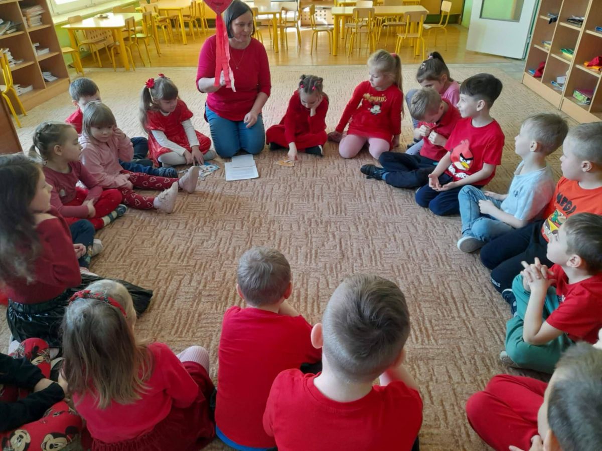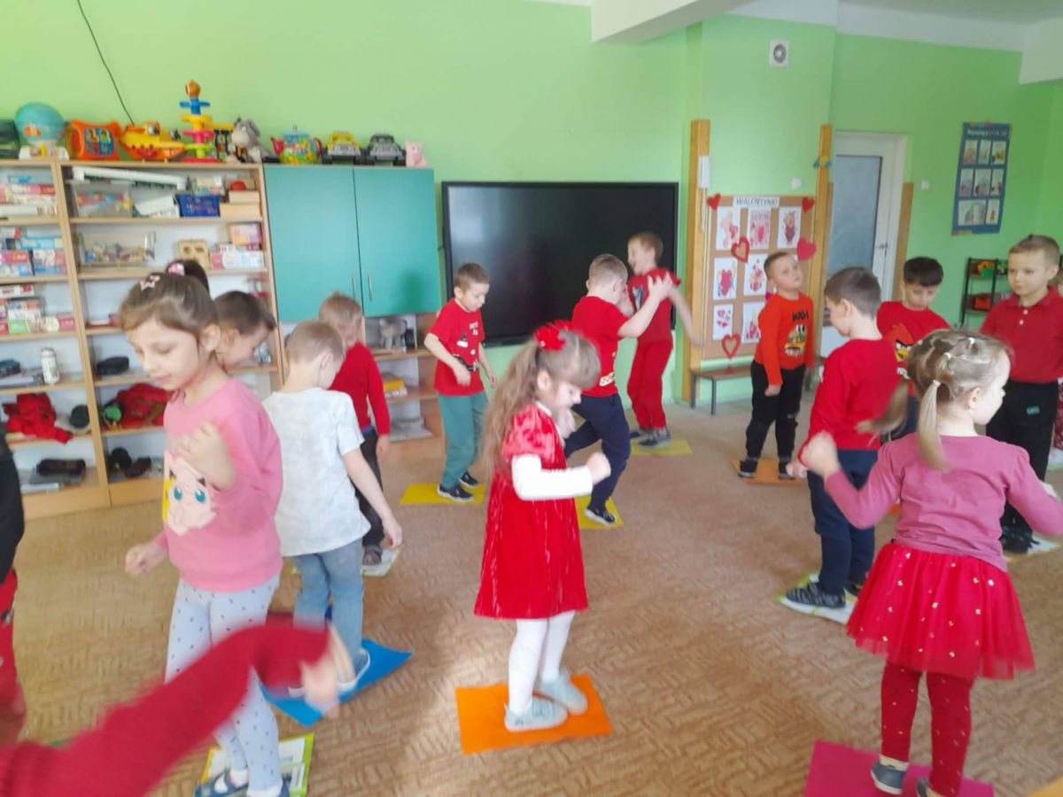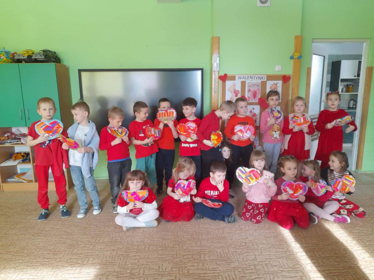 Przedszkolaki, ubrane na czerwono, uczestniczyły w różnych zabawach związanych z walentynkami. Poznały tradycje Walentynek, rozmawiały o tym jak można okazywać szczęście, przyjaźń, miłość bliskim osobom. Był to dzień przyjaźni, radości z przebywania z sobą nawzajem.