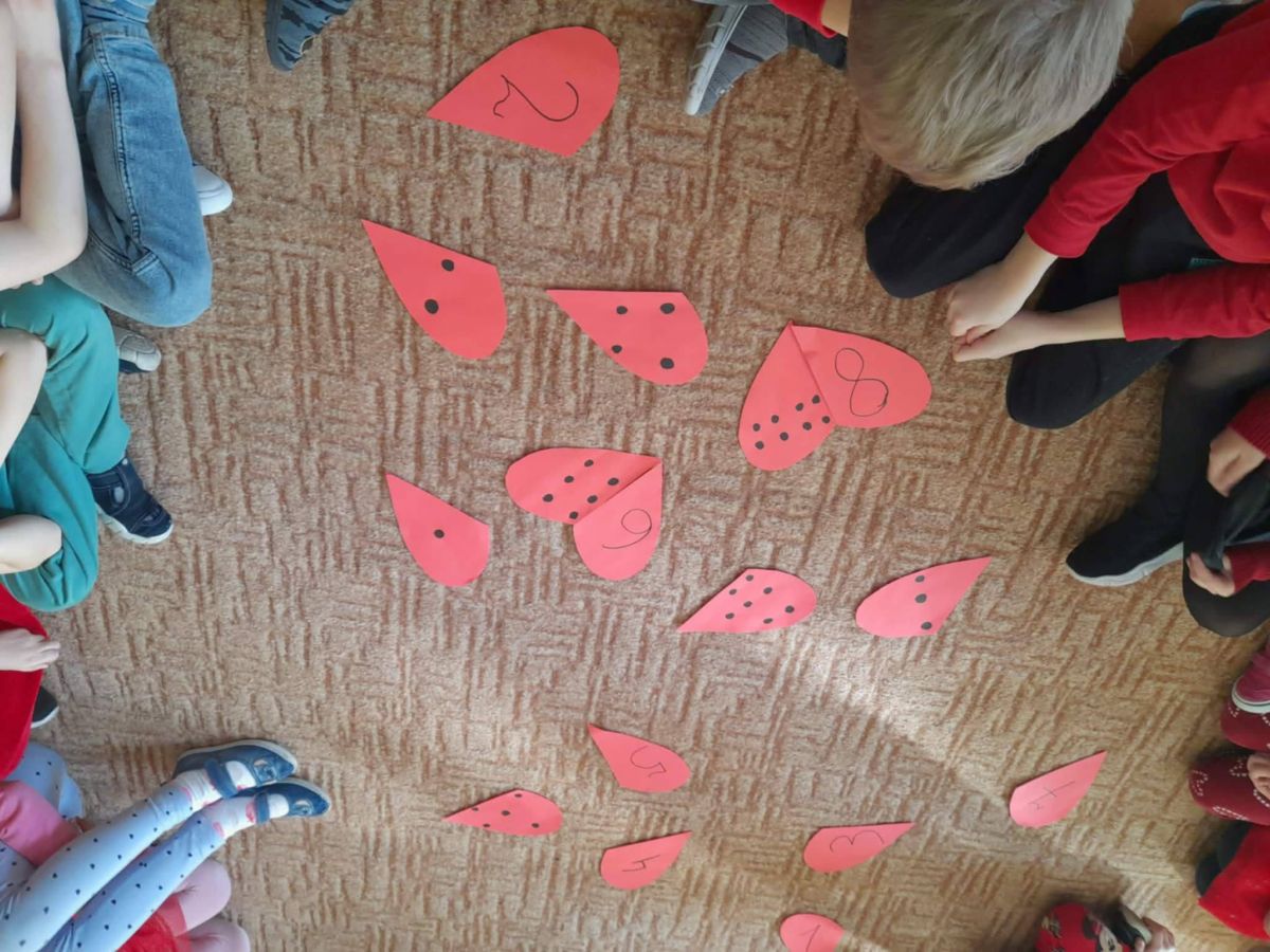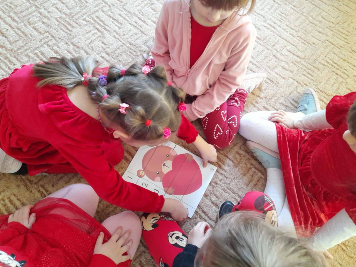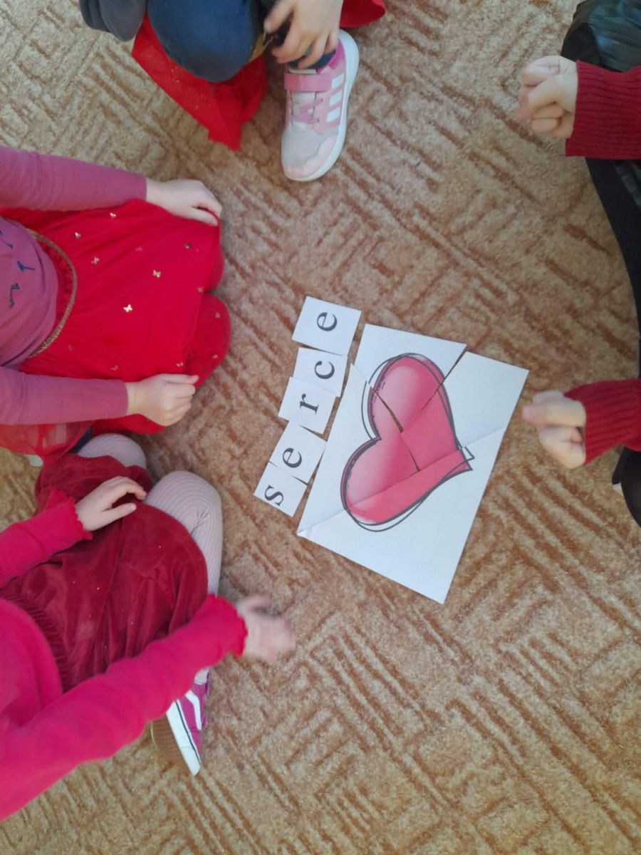 Przedszkolaki, ubrane na czerwono, uczestniczyły w różnych zabawach związanych z walentynkami. Poznały tradycje Walentynek, rozmawiały o tym jak można okazywać szczęście, przyjaźń, miłość bliskim osobom. Był to dzień przyjaźni, radości z przebywania z sobą nawzajem.