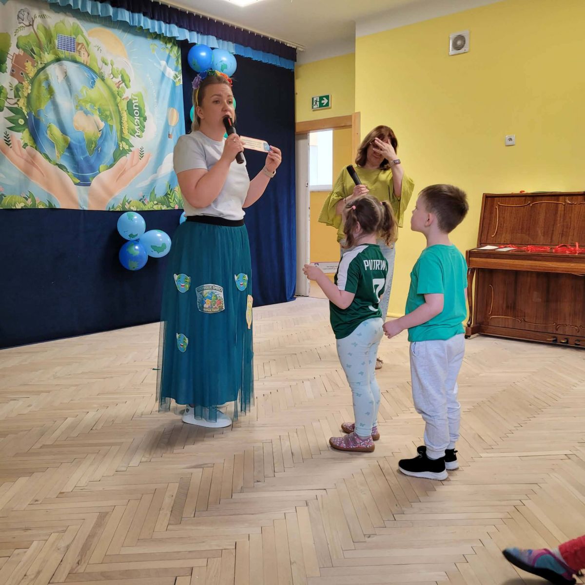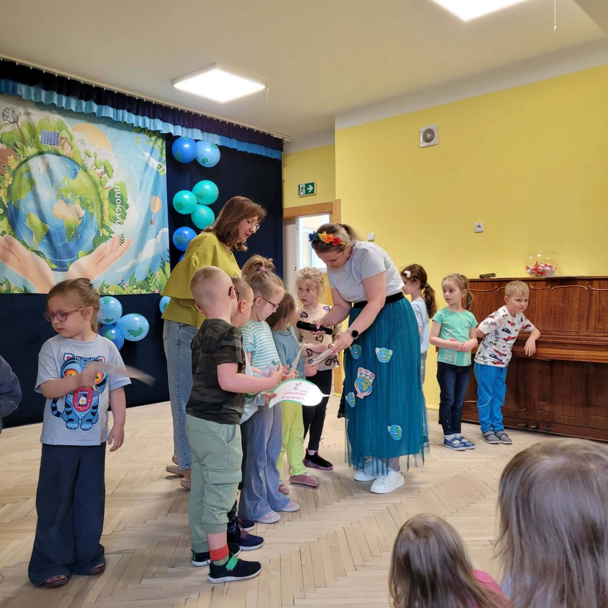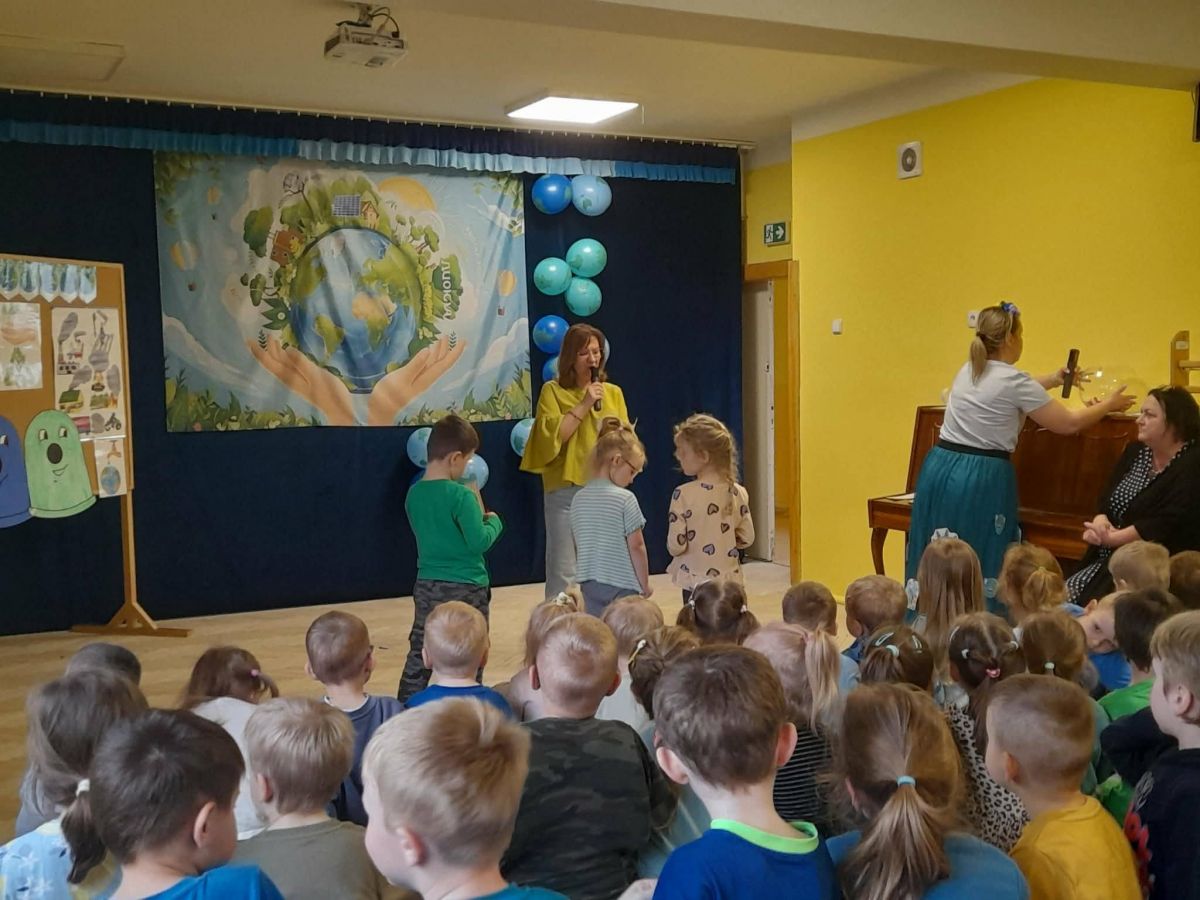 Przedszkolaki obejrzały inscenizację „Smutna Ziemia – wesoła Ziemia”, która w przystępny i obrazowy sposób ukazała skutki niewłaściwego dbania o środowisko oraz korzyści płynące z działań proekologicznych. Dzieci aktywnie uczestniczyły w wydarzeniu, chętnie odpowiadały na pytania, rozwiązywały zagadki oraz brały udział w rozmowie na temat segregacji odpadów i oszczędzania zasobów naturalnych.