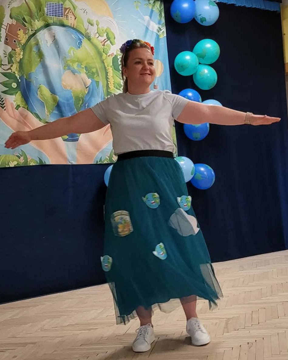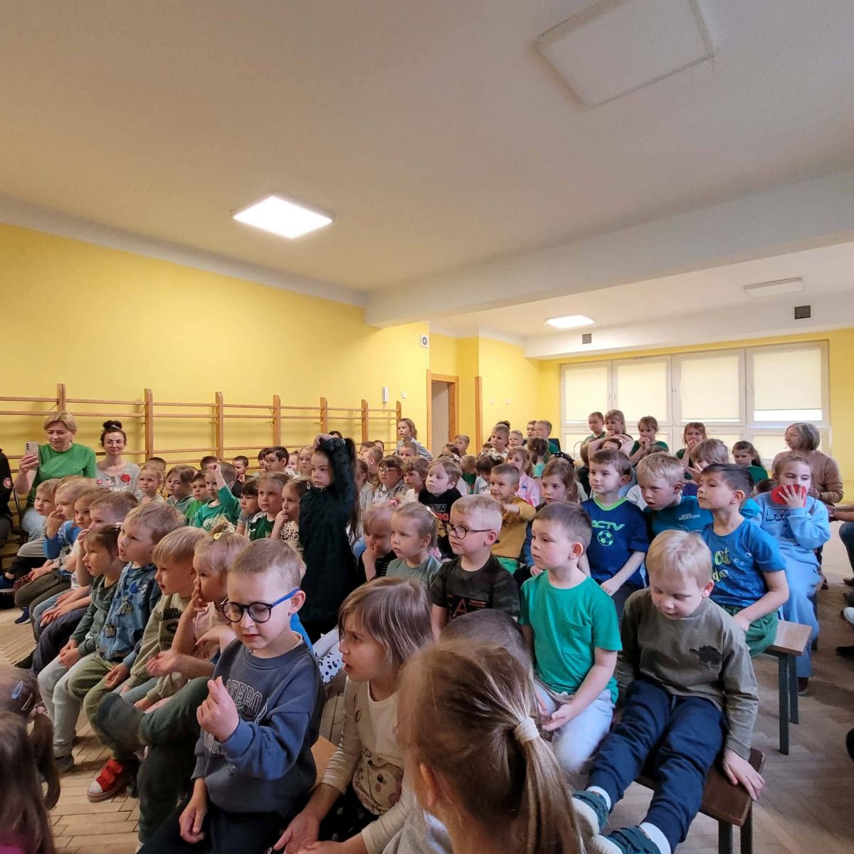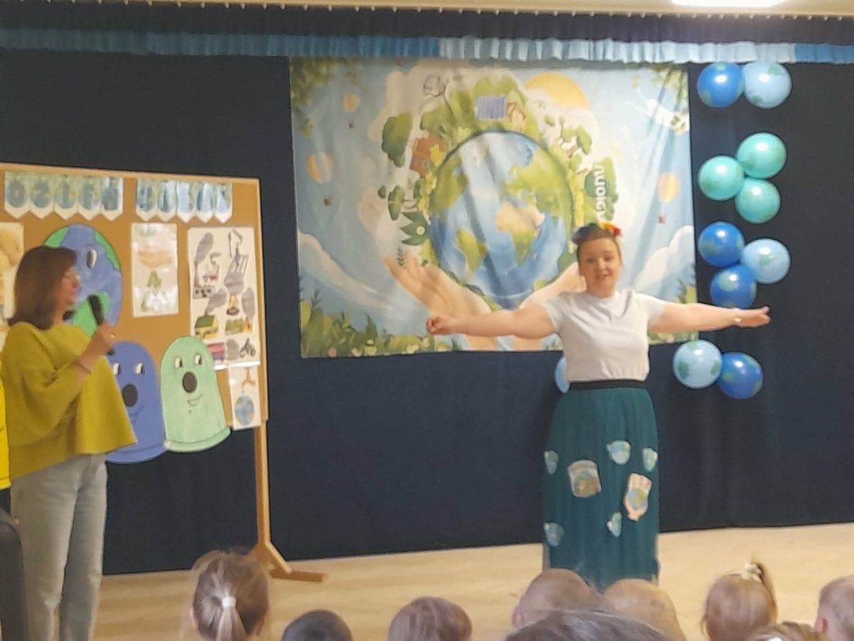 Przedszkolaki obejrzały inscenizację „Smutna Ziemia – wesoła Ziemia”, która w przystępny i obrazowy sposób ukazała skutki niewłaściwego dbania o środowisko oraz korzyści płynące z działań proekologicznych. Dzieci aktywnie uczestniczyły w wydarzeniu, chętnie odpowiadały na pytania, rozwiązywały zagadki oraz brały udział w rozmowie na temat segregacji odpadów i oszczędzania zasobów naturalnych.