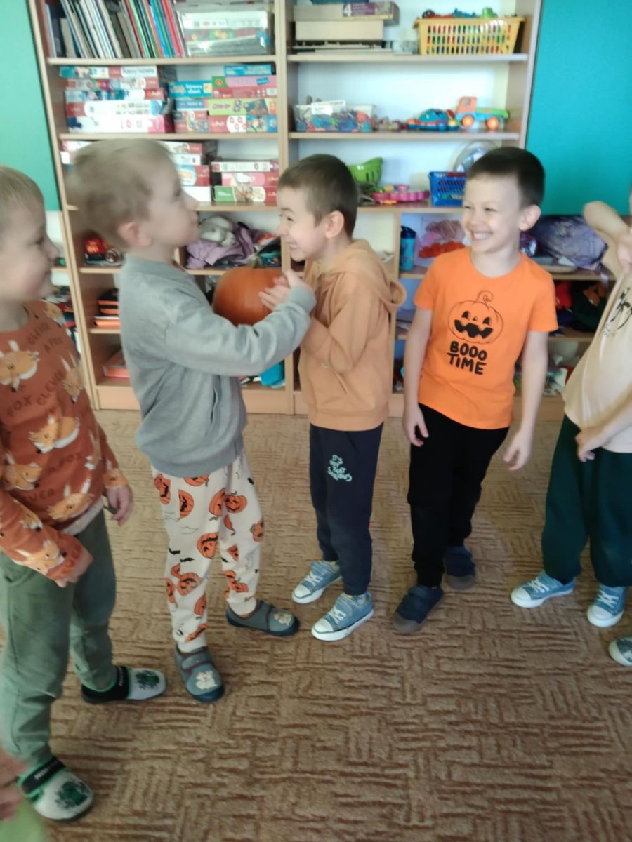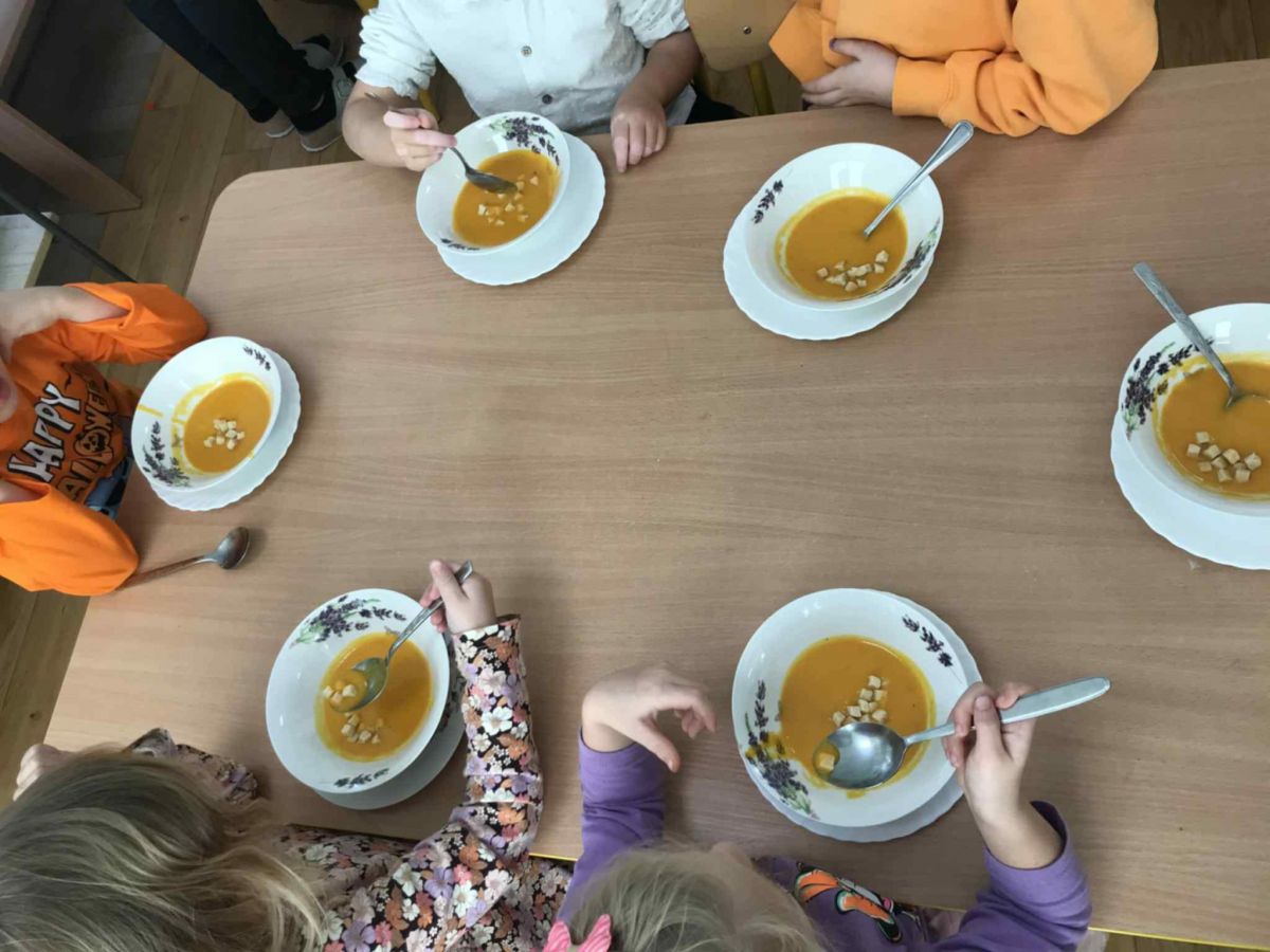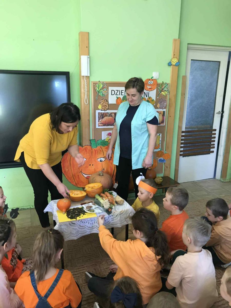 dzieci dowiedziały się jakie posiada wartości odżywcze oraz jakie potrawy można z niej przygotować. Były również zabawy oparte na muzyce i ruchu oraz "dyniowe zawody". Dodatkowo też przedszkolaki rozwijały kompetencje matematyczne. Odwiedziła nas pani Ula z naszej przedszkolnej kuchni, która opowiedziała jak należy przygotować pyszną i zdrową zupę z dyni,