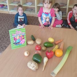 - pod takim hasłem Słoneczka obchodziły dziś Światowy Dzień Warzyw i Owoców. Na tę okazję zaprosiliśmy uczennice z Powiatowego Zespołu Szkoł w Chęcinach. Dziewczynki wyrecytowały dzieciom wiersz Jana Brzechwy ,,Na Straganie". Następnie wspólnie segregowaliśmy owoce i warzywa oraz rozpoznawaliśmy je po dotyku. Uwieńczeniem naszego spotkania było przygotowanie ,,Jesiennego pociągu do zdrowia".