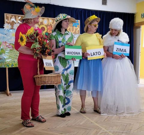 Dzisiaj nasze przedszkole odwiedziły piękne Panie - Pory Roku: Wiosna, Lato, Jesień i Zima. Zaprosiły dzieci do udziału w quizie "Jak pory roku bawią się w berka". Maluszki prezentowały piosenki, tańce oraz rozwiązywały zagadki słowne, słuchowe i obrazkowe. Egzamin ze znajomości pór roku zdały celująco.