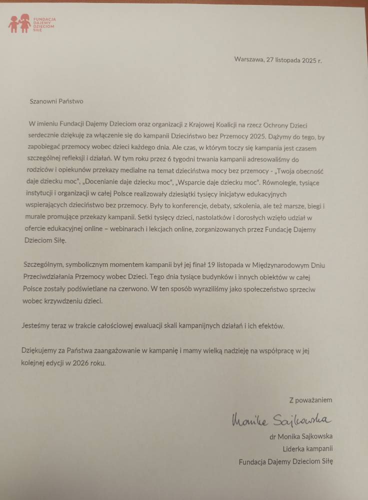 Przez sześć tygodni nasze przedszkole brało udział w kampanii Dzieciństwo bez Przemocy 2025. Wspólnie z Fundacją Dajemy Dzieciom Siłę i organizacjami z Krajowej Koalicji na Rzecz Ochrony Dzieci wykonaliśmy ważny krok ku lepszej ochronie naszych pociech.