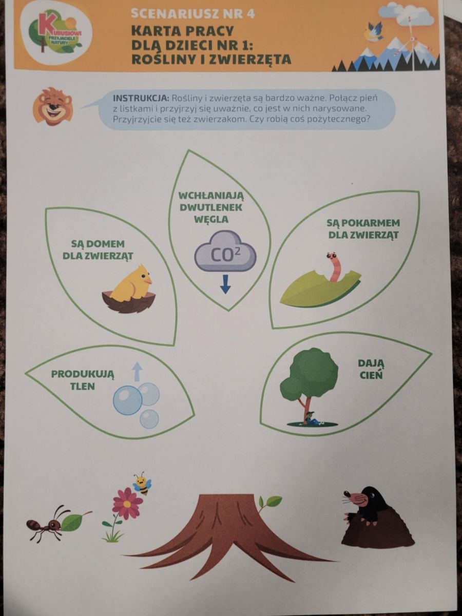uczestniczyły w zajęciach pod hasłem „MISJA LAS. NA TROPIE ROŚLIN I ZWIERZĄT”. Podczas wspólnej przygody z Misiem Kubusiem dzieci dowiedziały się, czym jest ekosystem, jak ważne są rośliny i zwierzęta w naszym życiu oraz w jaki sposób należy o nie dbać. Przedszkolaki nauczyły się również na co zwracać uwagę podczas wycieczki do lasu, aby nie zakłócać życia jego mieszkańców. Zajęcia zakończyły się wirtualnym spacerem po lesie![]()