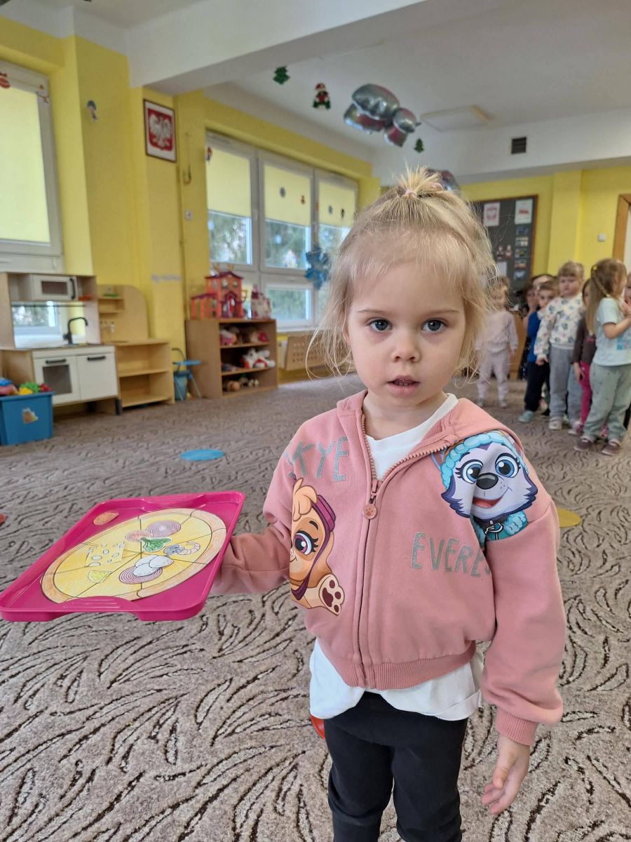 Na zajęciach dzieci miały okazję dowiedzieć się z jakich produktów powstaje pizza i jakich składników do niej potrzebujemy. Dzieci w trakcie zabaw świetnie się bawiły. ![]()