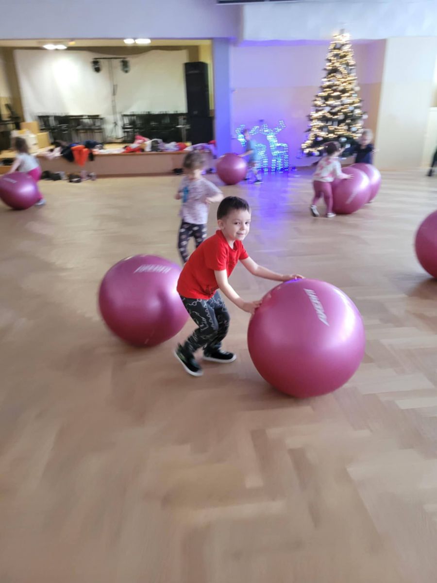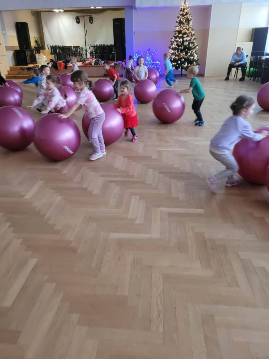 Podczas zajęć przedszkolaki brały udział w różnorodnych aktywnościach ruchowych. Bawiły się chustą animacyjną oraz piłkami gimnastycznymi, rozwijając koordynację i sprawność ruchową. Zachęcające opowieści o reniferach Świętego Mikołaja