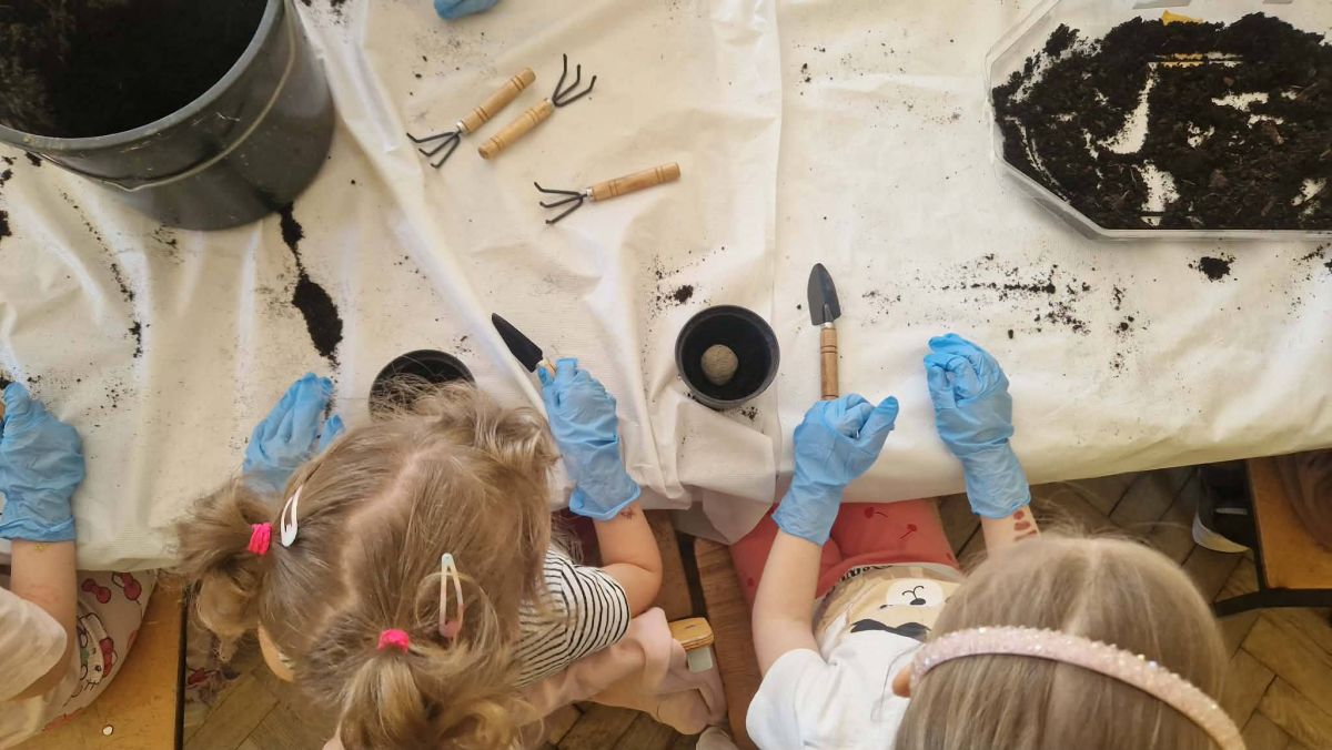 Podczas warsztatów dzieci sadziły rośliny w doniczkach. Każde dziecko swoją własną kompozycję zabierze do domu. Teraz przedszkolaki będą mogły obserwować, co z niej wyrośnie – a to pozostaje miłą niespodzianką.