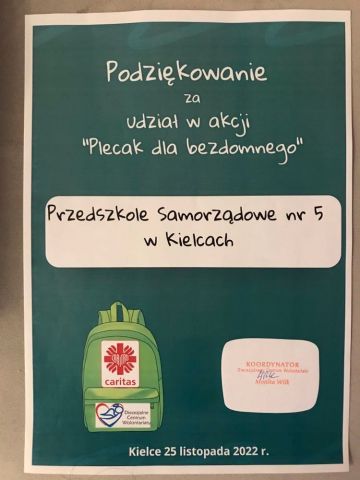 Drodzy Rodzice! Serdecznie dziękujemy za udział w akcji "Plecak dla bezdomnego". Zebrane dary zostały przekazane do Diecezjalnego Centrum Wolontariatu w Kielcach.