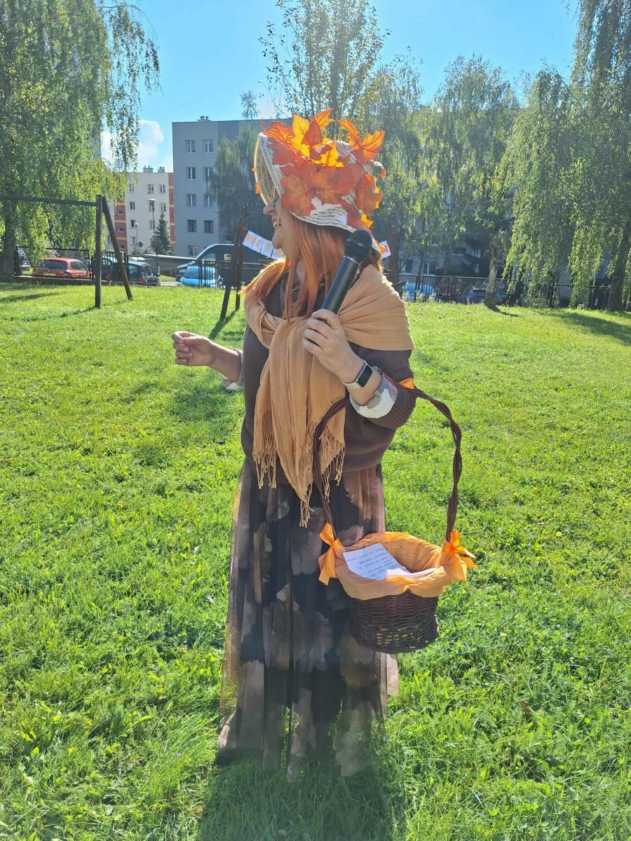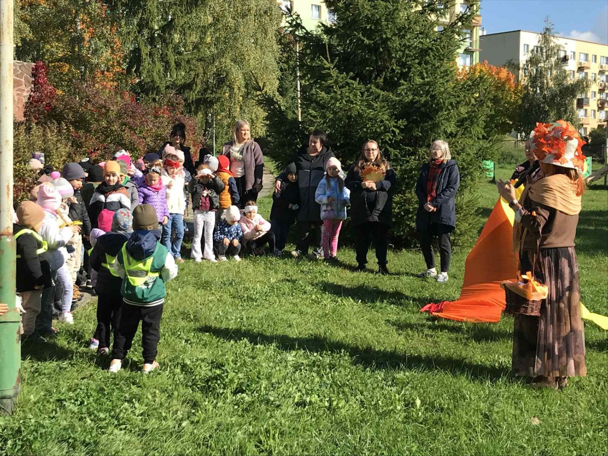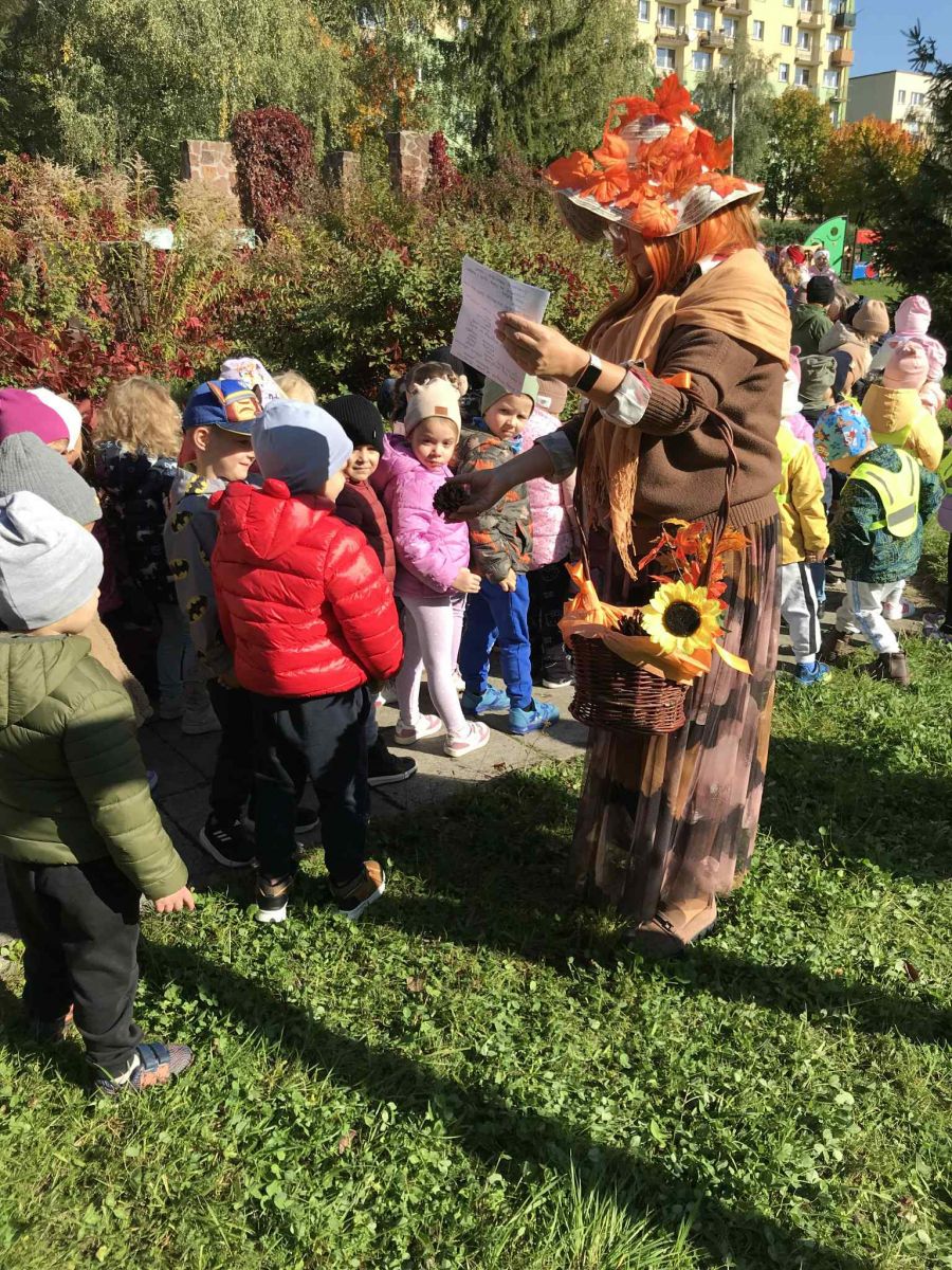 Dzieci przywitały ją wesołymi piosenkami. W zamian Jesień przyniosła swoje dary, których przedszkolaki szukały w ogrodzie.