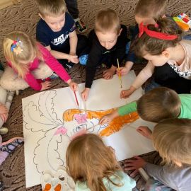 Były zabawy ruchowe ze śpiewem „Urodziny marchewki”, pogadanki o marchewce, omawianie ilustracji, rozwiązywanie zagadek, praca plastyczna – „Wesoła marchewka”.