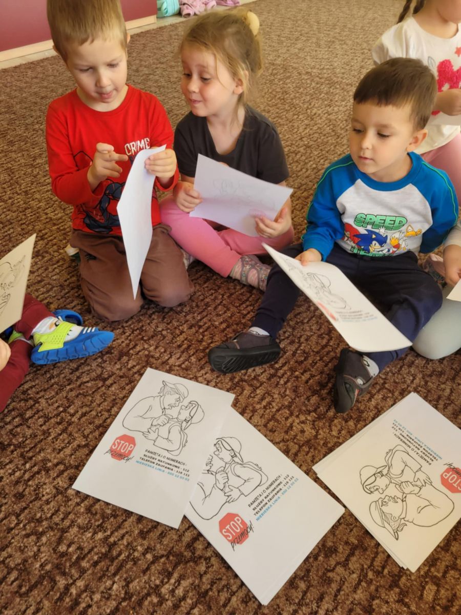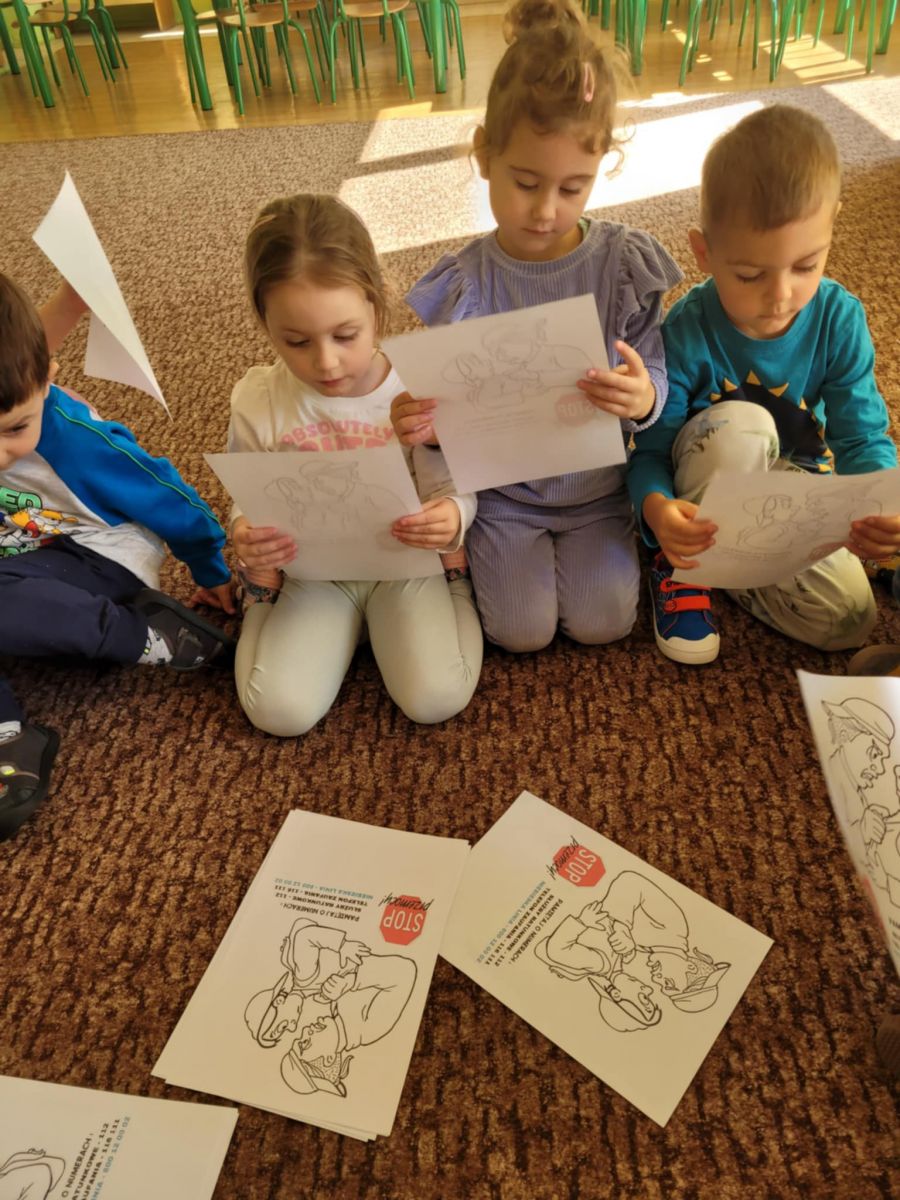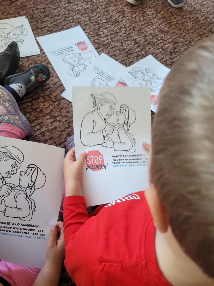 Podczas spotkania maluszki rozmawiały o tym, czym jest przemoc, jak ją rozpoznawać i gdzie szukać pomocy. Wspólnie zastanawiały się, jak ważny jest szacunek, życzliwość i wspieranie innych w codziennych sytuacjach. Na zakończenie zajęć przygotowały ulotkę informacyjną, w której zawarły najważniejsze zasady reagowania na przemoc oraz numery telefonów, pod które można zwrócić się o pomoc.