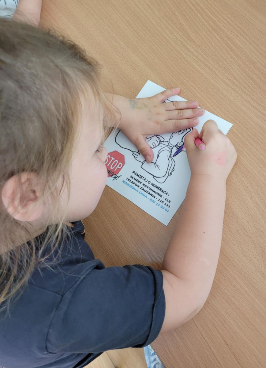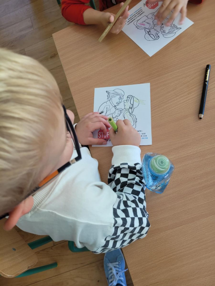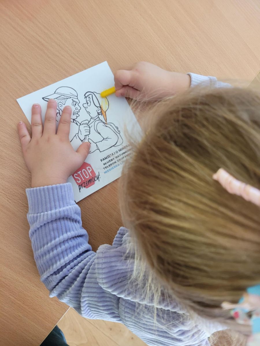 Podczas spotkania maluszki rozmawiały o tym, czym jest przemoc, jak ją rozpoznawać i gdzie szukać pomocy. Wspólnie zastanawiały się, jak ważny jest szacunek, życzliwość i wspieranie innych w codziennych sytuacjach. Na zakończenie zajęć przygotowały ulotkę informacyjną, w której zawarły najważniejsze zasady reagowania na przemoc oraz numery telefonów, pod które można zwrócić się o pomoc.