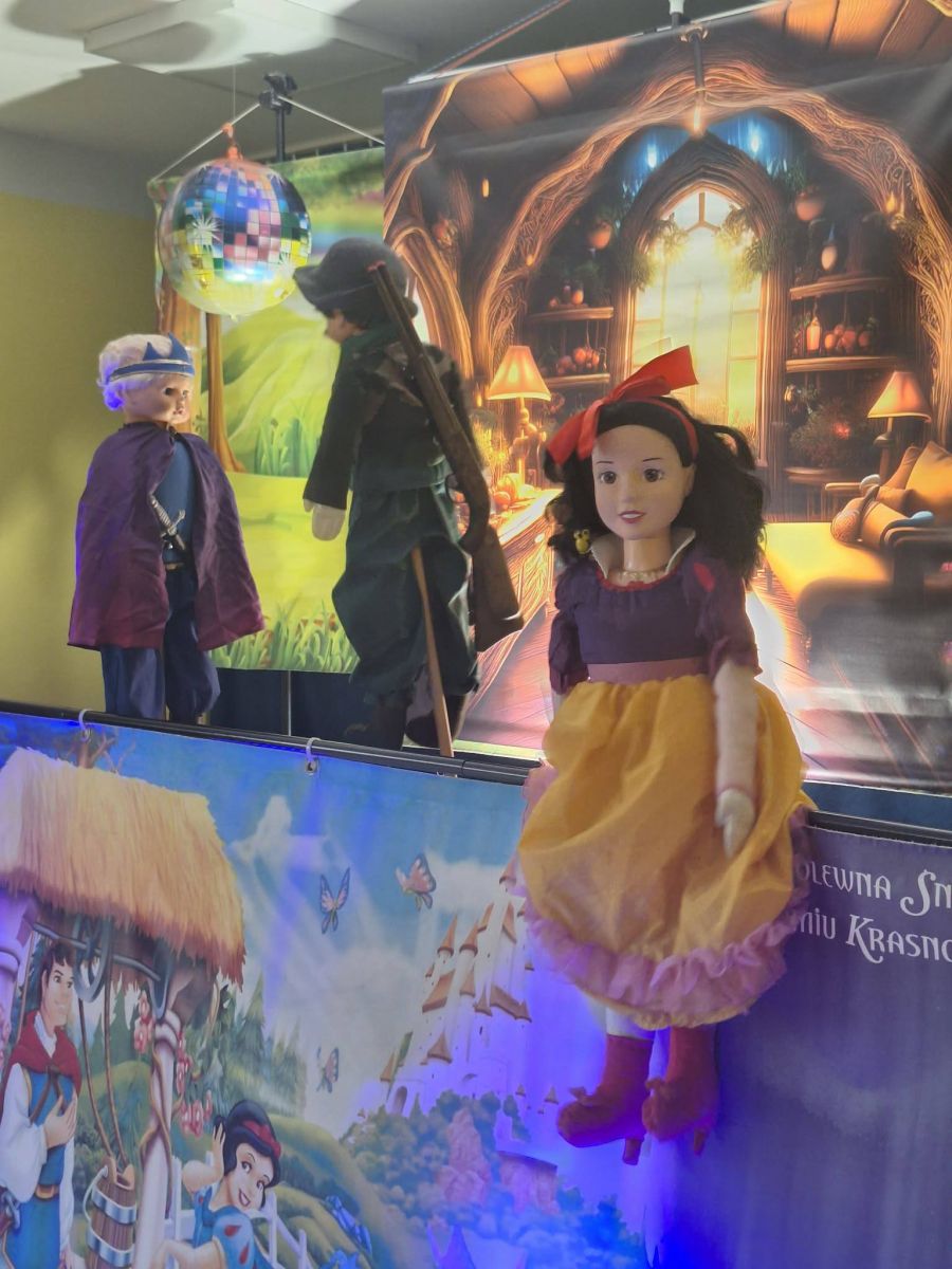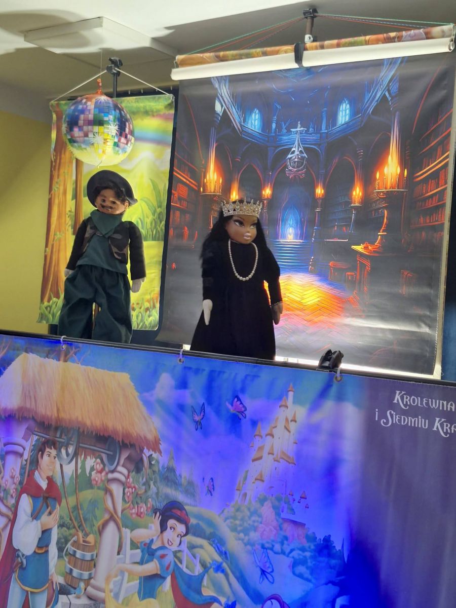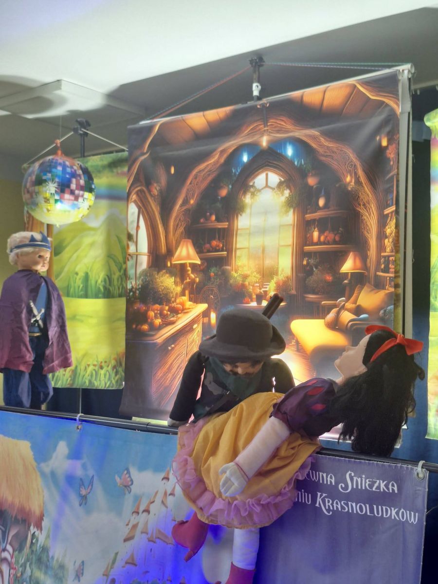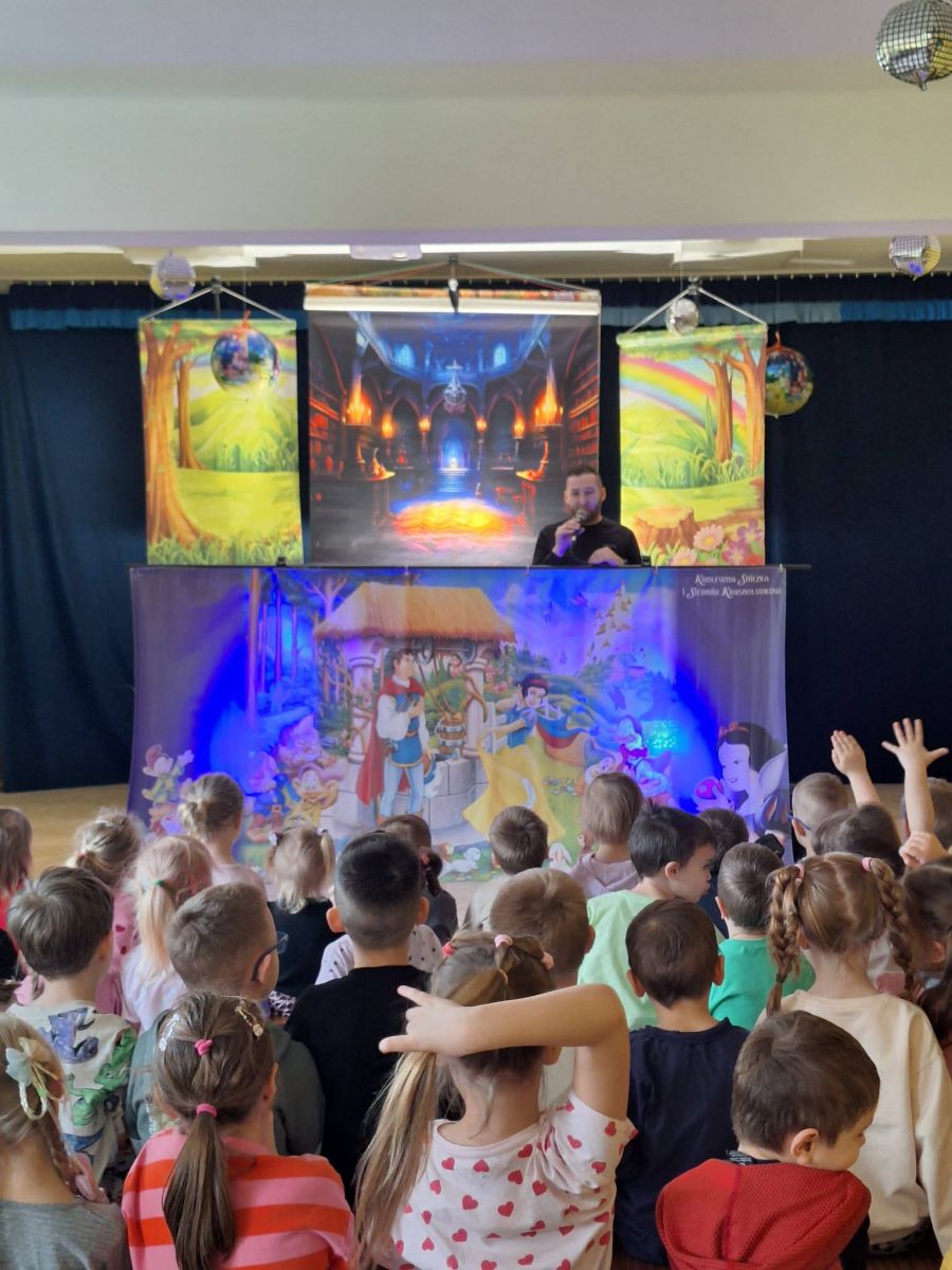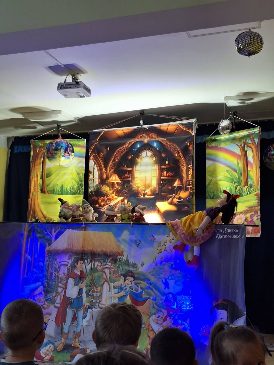 który jest adaptacją znanej bajki braci Grimm. Zła macocha dowiedziawszy się, że Śnieżka jest od niej piękniejsza wpada w wielką złość. Rozkazuje myśliwemu porzucić dziewczynkę w lesie. Królewna chroni się w domku krasnoludków, które przyjmują ją pod swój dach i przestrzegają przed wpuszczaniem obcych do domu. Śnieżka zapomina jednak o ostrzeżeniu i wpuszcza do domu miłą staruszkę. Okazuje się, że pod przebraniem kryje się Zła Macocha, która częstuje ufną Śnieżkę zatrutym jabłkiem. Na szczęście książę przybywa na czas i ratuje Królewnę. Przedszkolakom bardzo podobał się spektakl i brały w nim aktywny udział. Bajka oprócz dobrej zabawy uczy, że warto pomagać innym i przestrzega przed łatwowiernością w stosunku do innych. ![]()