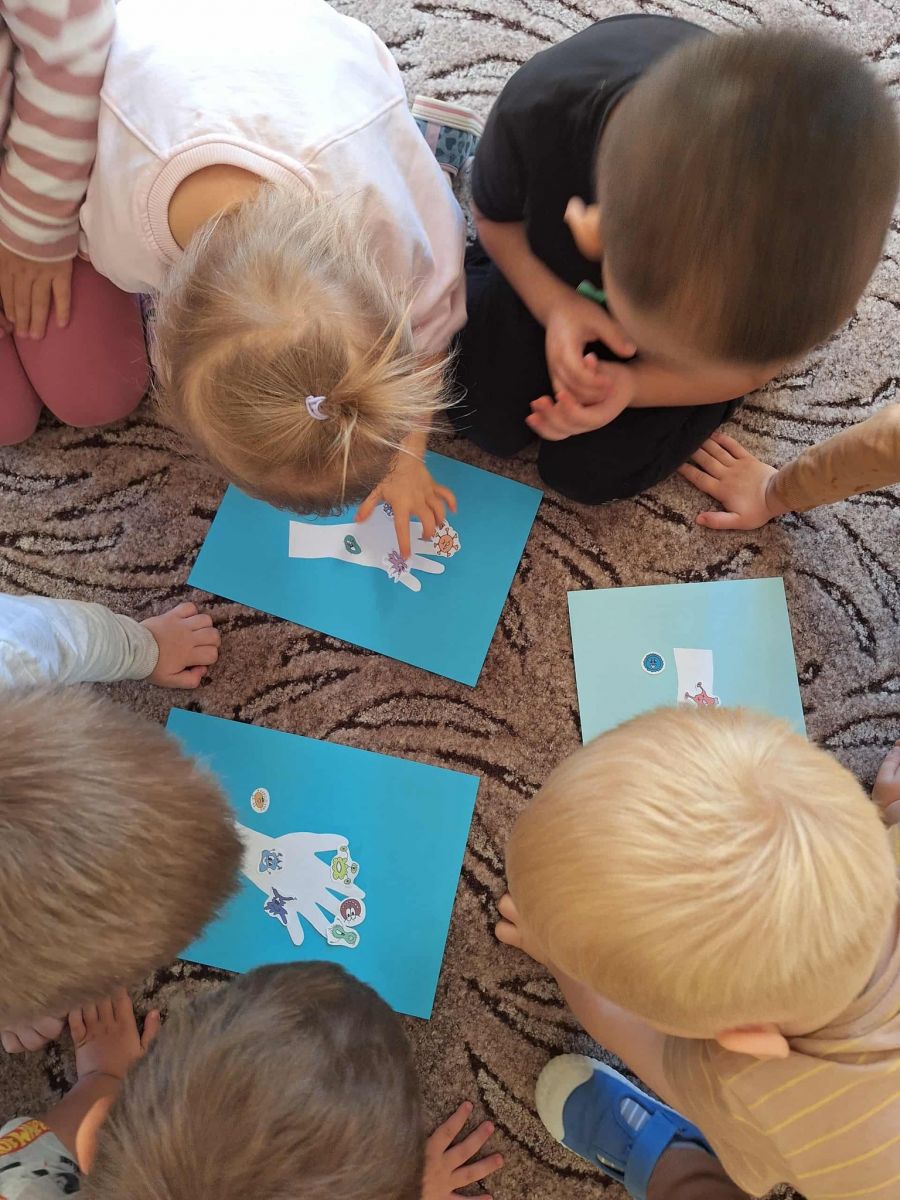 które dostają się do naszego organizmu, dzieci dowiedziały się jakie znaczenie dla zdrowia ma dokładne mycie rąk. Omówiliśmy także schemat mycia dłoni oraz zastosowaliśmy go w praktyce.