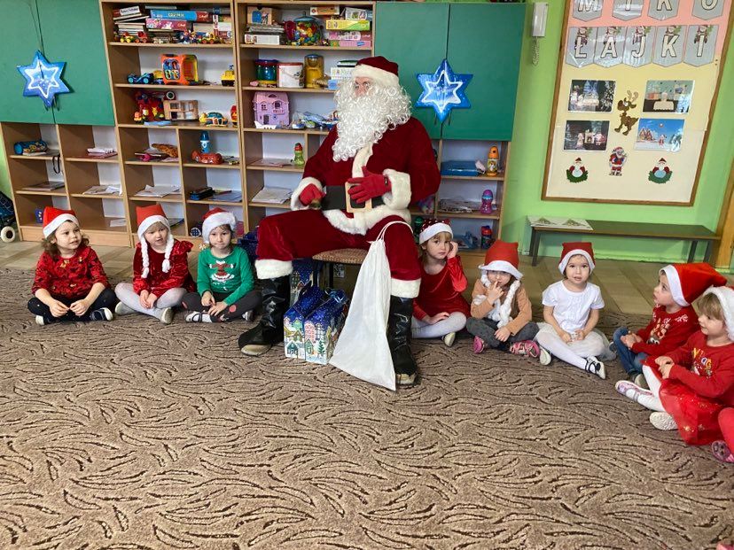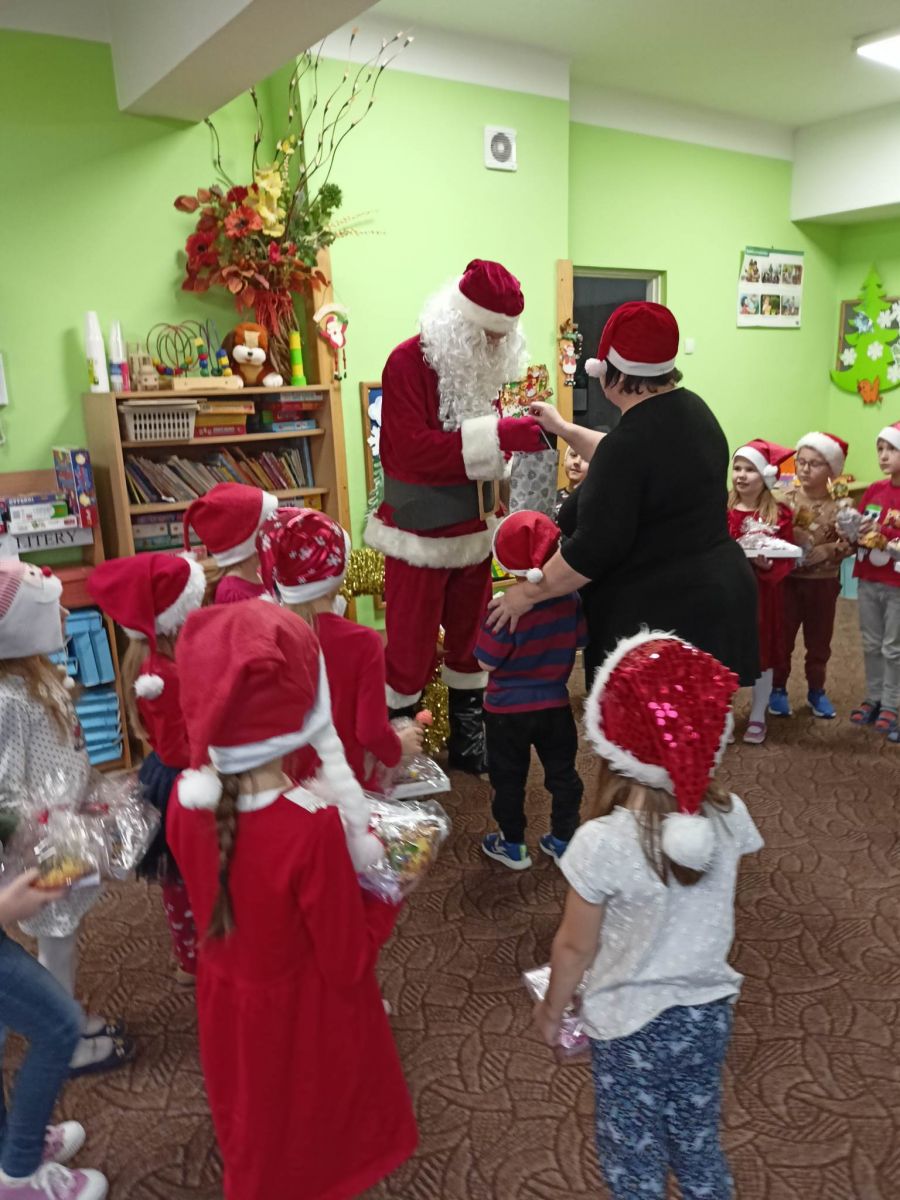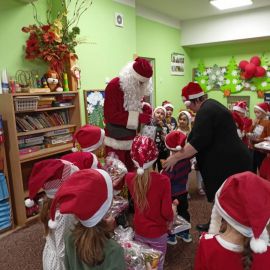 Dnia 6. grudnia w naszym przedszkolu pojawił się długo oczekiwany gość. Przybył do nas pomimo braku śniegu. Na jego wizytę dzieci czekały z niecierpliwością. Powitaliśmy świętego Mikołaja wierszem, piosenką i ciasteczkami. Spotkanie minęło w bardzo miłej atmosferze i przyniosło wiele radości. Idol dzieci obdarował wszystkie maluszki prezentami. Cieszymy się, że o nas pamiętał i czekamy na jego wizytę w przyszłym roku. ![]()