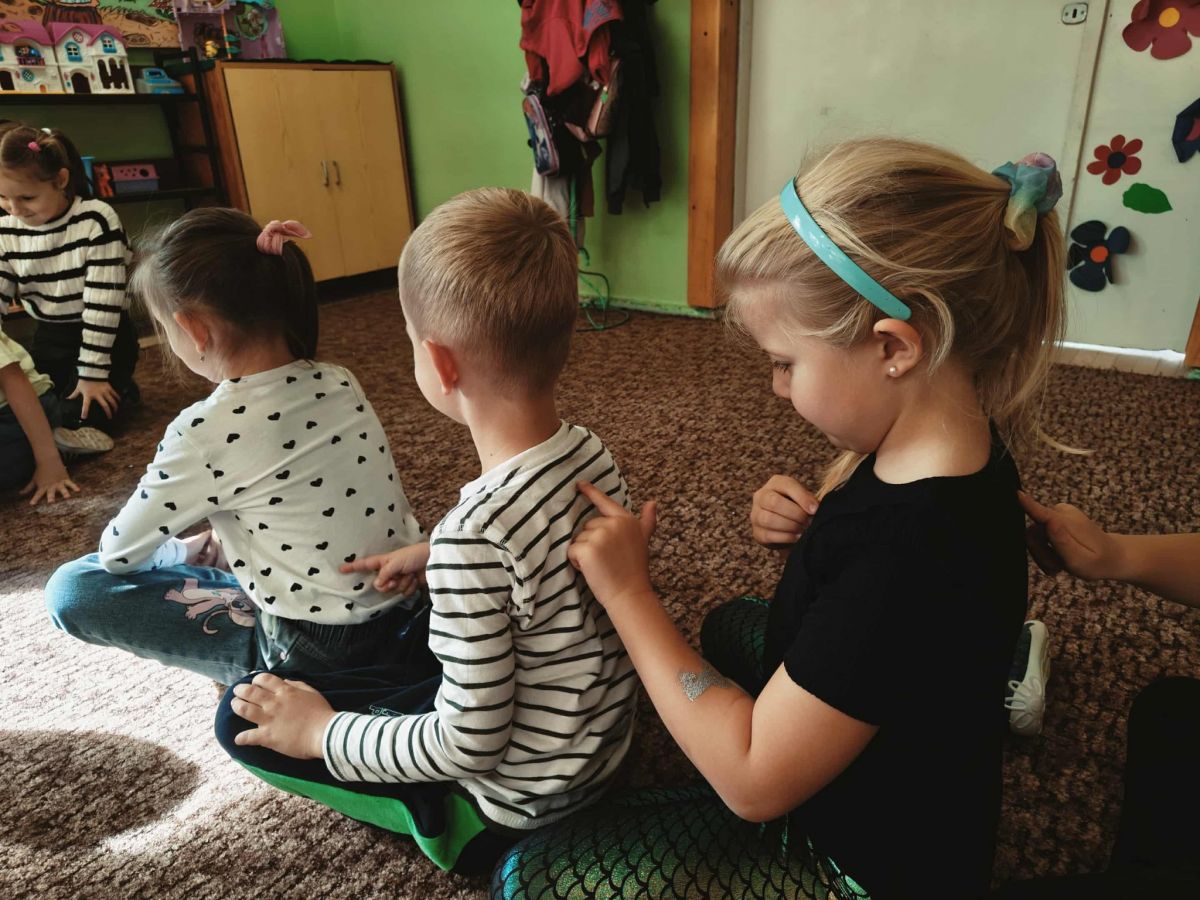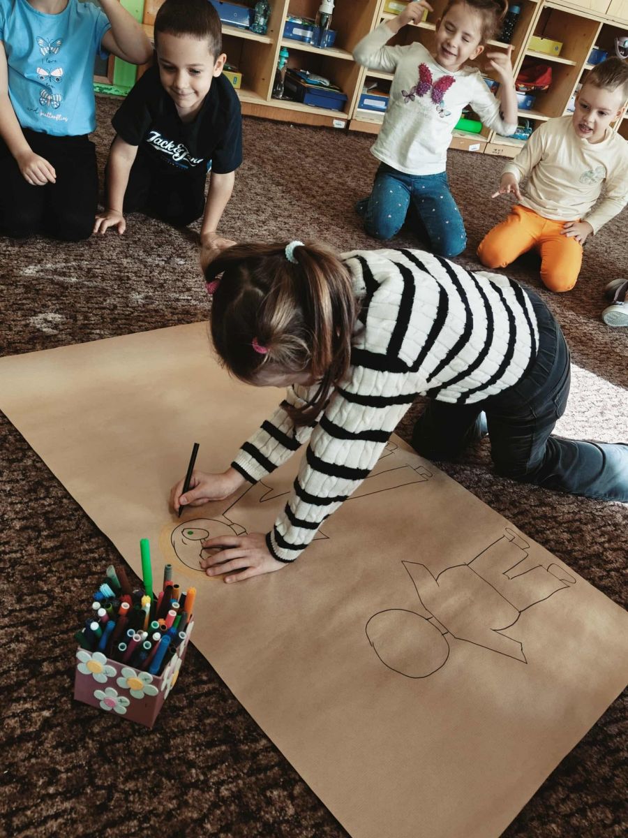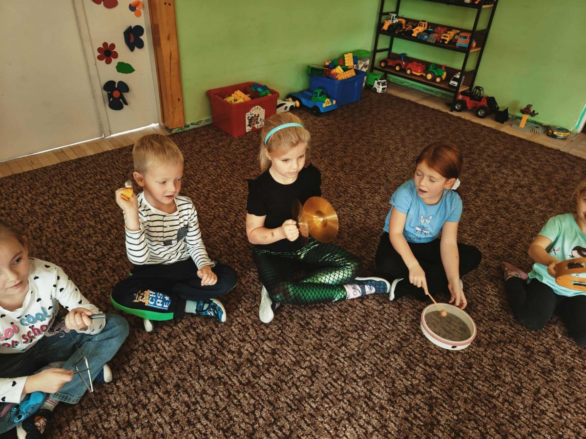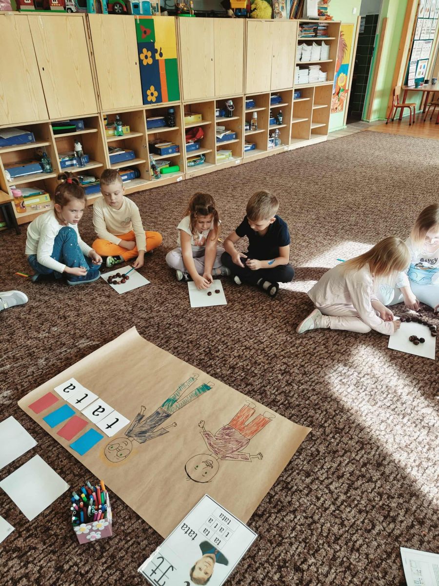 Poprzez różne zabawy odkrywały znak graficzny litery, dzieliły wyrazy na sylaby i głoski za pomocą instrumentów. Zabawy sprawiały dzieciom dużo radości. ![]()