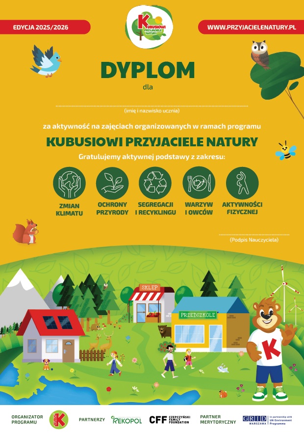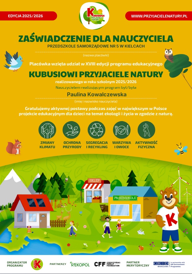 W roku szkolnym 2025/2026 nasze przedszkole wzięło udział w XVIII edycji ogólnopolskiego programu edukacyjnego „Kubusiowi Przyjaciele Natury”, poświęconego tematyce ekologicznej. Dzieci, poprzez ciekawe zajęcia, zabawy i doświadczenia, poszerzały wiedzę na temat ochrony środowiska, zdrowego stylu życia oraz dbania o przyrodę.