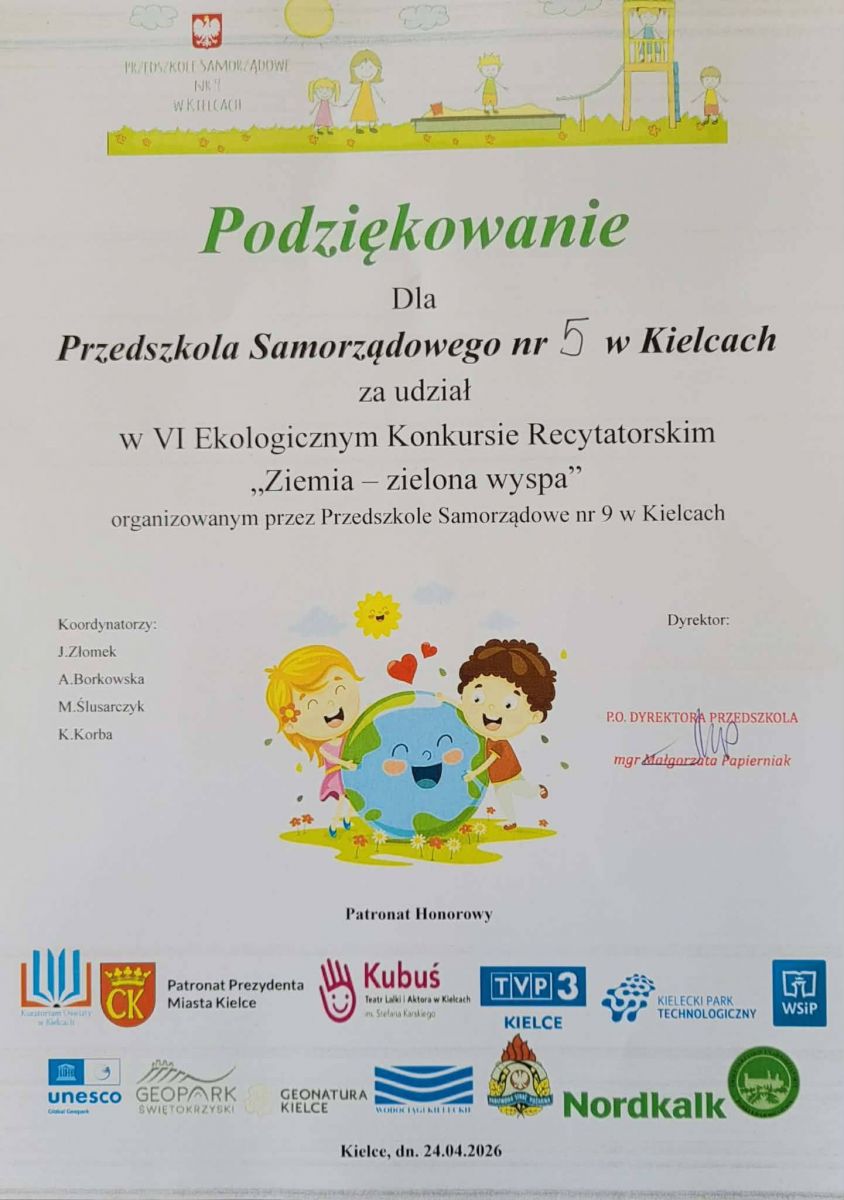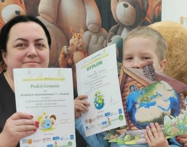 Krzysiu S. z grupy "Misie" wziął udział w VI Międzyprzedszkolnym Ekologicznym Konkursie Recytatorskim pt. „Ziemia – zielona wyspa”, który odbył się w Przedszkole Samorządowe nr 9 w Kielcach. Z dużym zaangażowaniem zaprezentował wiersz Gabriela Skrzypczak pt. „O przyrodę dbamy, zniszczyć jej nie damy”. Za piękny występ otrzymał dyplom oraz upominek. Serdecznie gratulujemy!