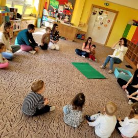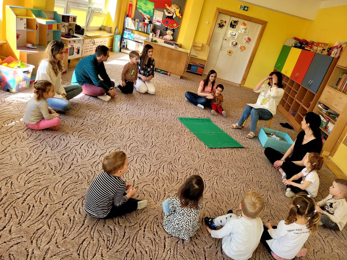 Celem zajęć było kształtowanie postaw proekologicznych w życiu codziennym. Rodzice, wspólnie ze swoimi pociechami, segregowali śmieci, tłumaczyli co to recykling oraz czytali ciekawostki na temat ochrony środowiska. Zabawy ruchowo - taneczne dostarczyły wiele radości i małym i dużym "uczniom".