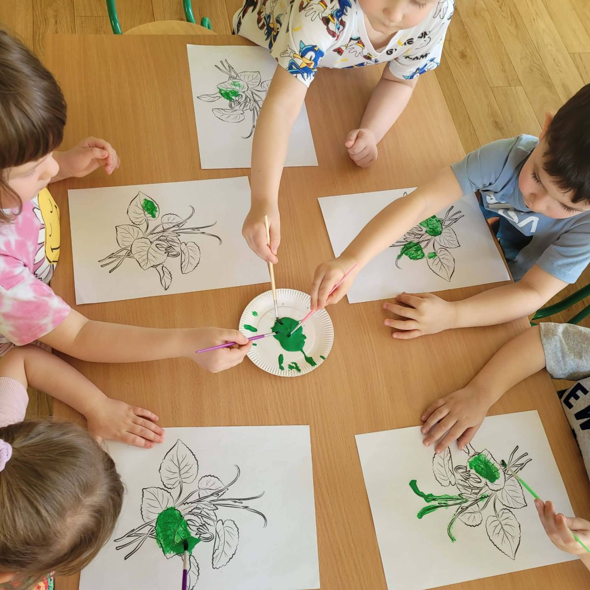 które jest ich ulubioną techniką, sprawiło im wiele radości. Dodatkowo „Misie” poznały nową, ciekawą metodę – malowanie przy użyciu balonika foliowego. Efekty tej pracy były bardzo zaskakujące i kreatywne, a dzieci chętnie eksperymentowały z nową formą wyrazu.