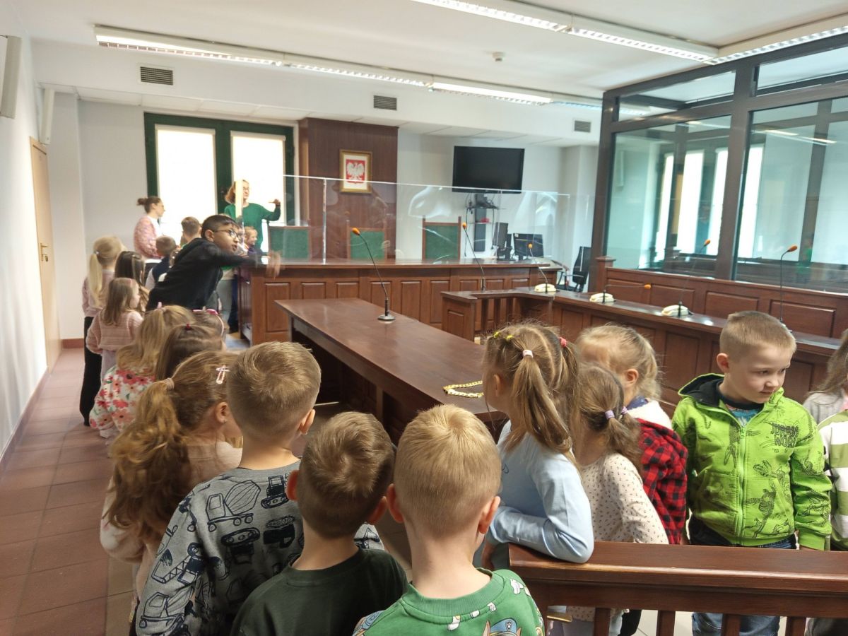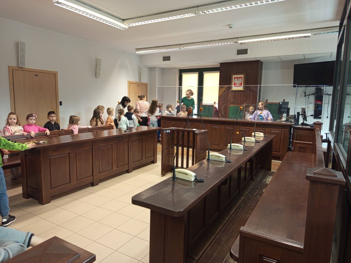 Ogromnym przeżyciem było również zwiedzanie sali rozpraw. Dzieci mogły zobaczyć, gdzie zasiada sędzia, świadkowie oraz uczestnicy postępowań. Z wielkim zaciekawieniem obserwowały każdy element sali, a możliwość „wcielenia się” na chwilę w rolę sędziego czy uczestnika rozprawy wywołała wiele radości i uśmiechu.