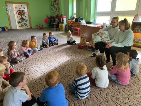 Systematyczny kontakt dziecka z książką aktywizuje jego rozwój emocjonalny i intelektualny, rozwija twórczą postawę, budzi wrażliwość estetyczną oraz wyzwala ekspresję dziecięcą. Wiemy, że czytanie rozwija wyobraźnię i kreatywność, dlatego zaprosiliśmy do naszego przedszkola uczennice z Powiatowego Zespołu Szkół w Chęcinach.