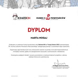 Nasze przedszkole, od września 2022r., brało udział w akcji BohaterON w Twojej Szkole 2022, realizowanej w ramach ogólnopolskiej kampanii BohaterON - włącz historię! Dzieci brały udział w zajęciach o tematyce historycznej i wykonały kartki dla Powstańców. Zaangażowali się również rodzice dokonując wpisów i dziękując Żołnierzom za ich odwagę i waleczność. Akcja właśnie się zakończyła. Otrzymaliśmy podziękowania i pamiątkowe dyplomy.